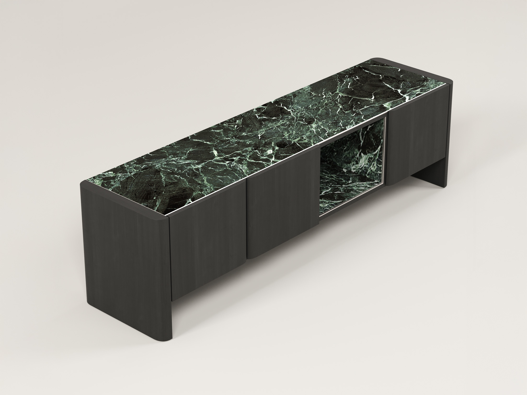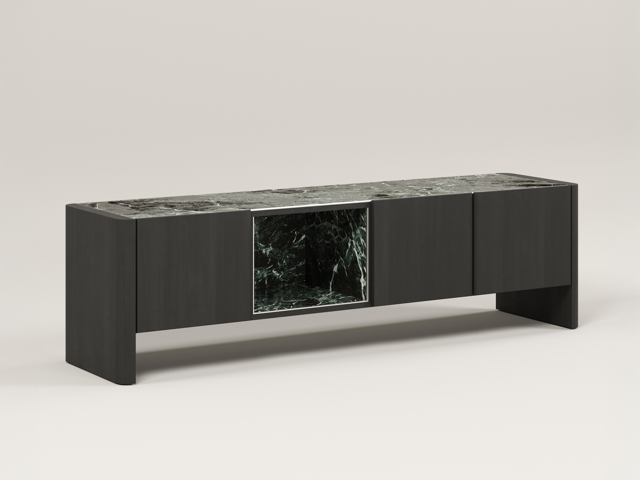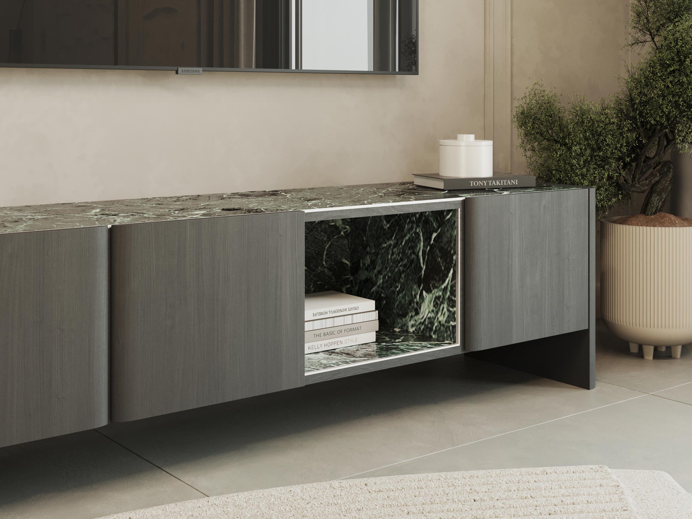Η επάνω επιφάνεια και η κεντρική εσοχή, επενδυμένες με κεραμικό, προσθέτουν ένα εντυπωσιακό οπτικό στοιχείο και υψηλή ανθεκτικότητα. Οι ευρύχωροι αποθηκευτικοί χώροι πίσω από τις πόρτες προσφέρουν πρακτικότητα, ενώ η ανοιχτή κεντρική θήκη είναι ιδανική για τη διακόσμησή σας.