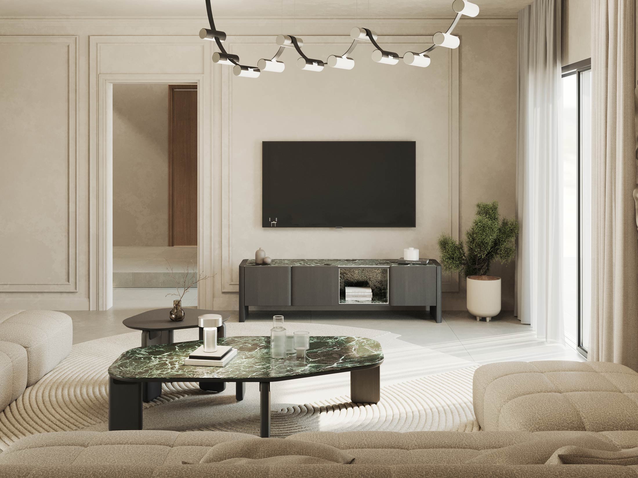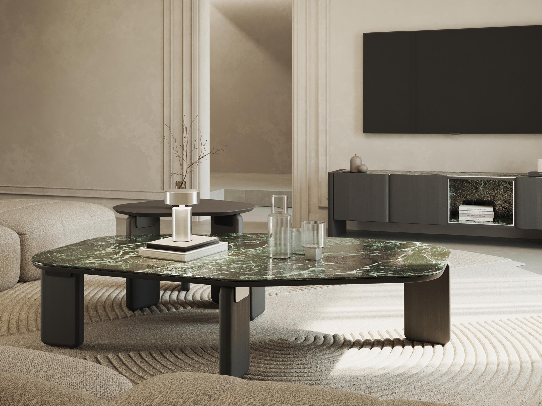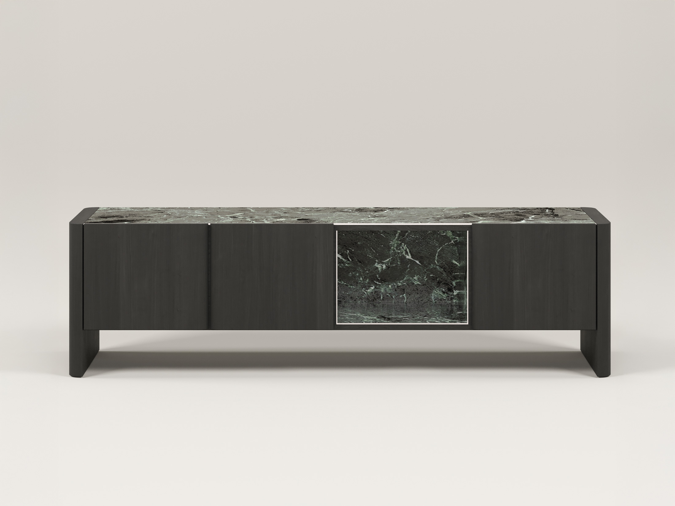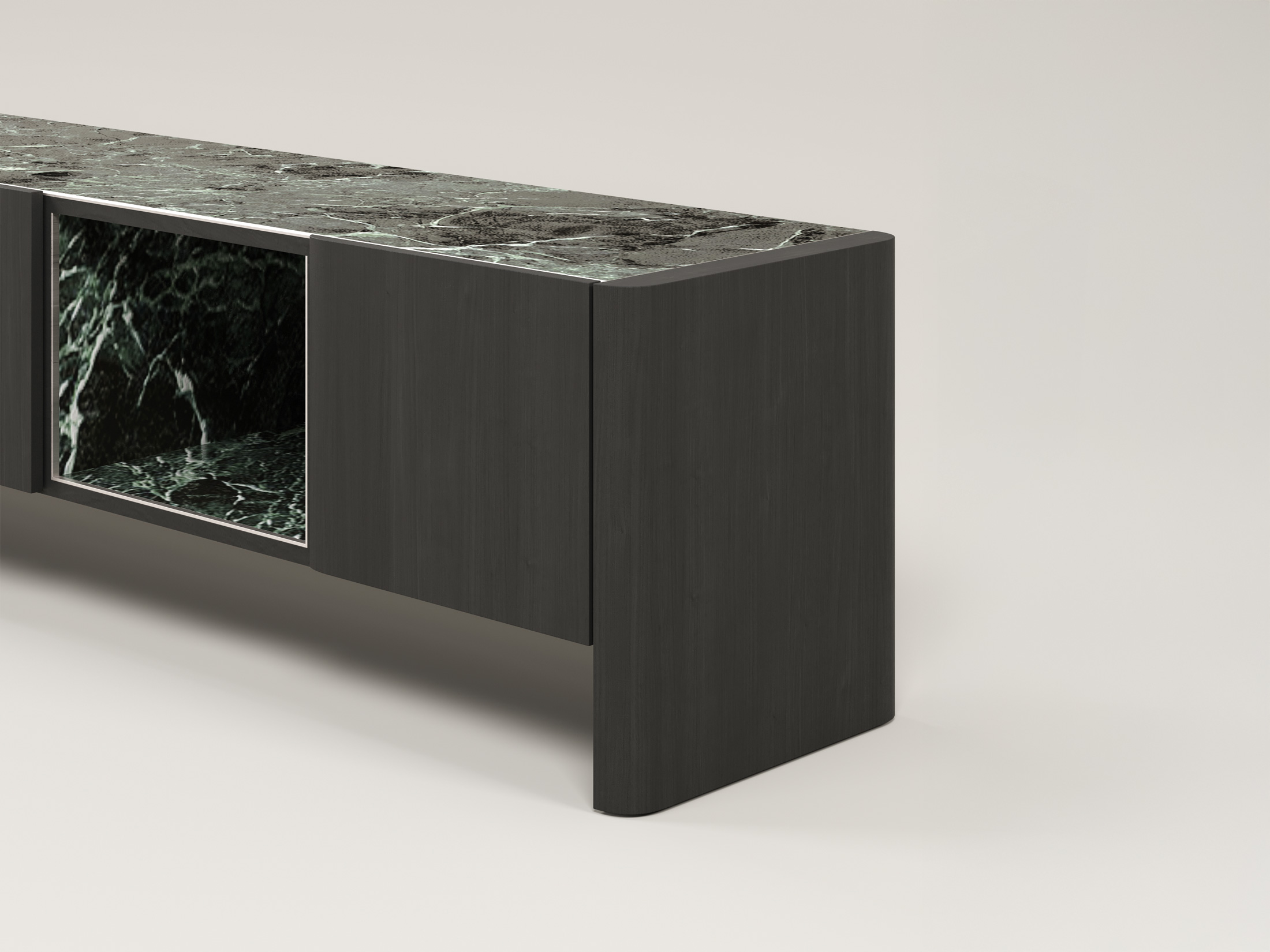 Η επάνω επιφάνεια και η κεντρική εσοχή, επενδυμένες με κεραμικό, προσθέτουν ένα εντυπωσιακό οπτικό στοιχείο και υψηλή ανθεκτικότητα. Οι ευρύχωροι αποθηκευτικοί χώροι πίσω από τις πόρτες προσφέρουν πρακτικότητα, ενώ η ανοιχτή κεντρική θήκη είναι ιδανική για τη διακόσμησή σας.