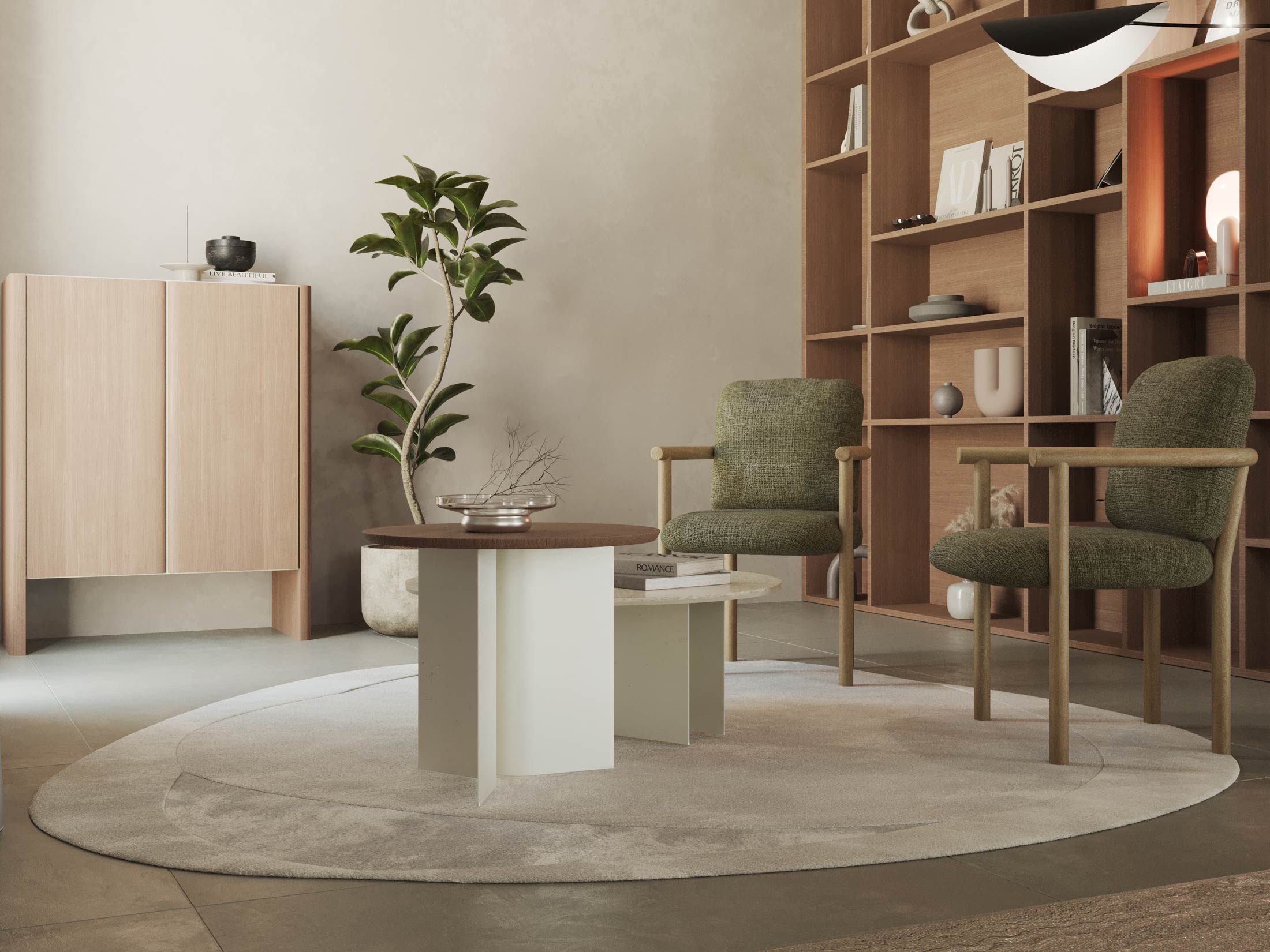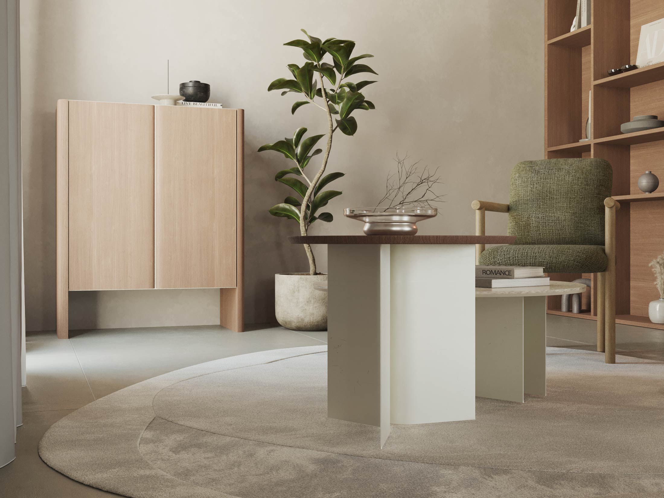 Η επιφάνεια του από επένδυση φυσικού δρυ και λάκα προσθέτει ζεστασιά και φυσική ομορφιά. Τα μεταλλικά του πόδια (3-Round) διαθέτουν μοναδικό σχεδιασμό που συνδυάζει σταθερότητα και αισθητική, δημιουργώντας ένα εντυπωσιακό κεντρικό στοιχείο στον χώρο του καθιστικού.